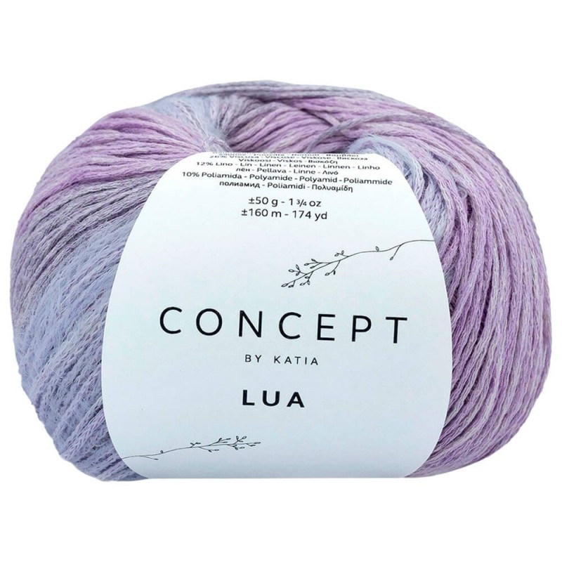 Discover Lua by Concept by Katia, a sophisticated and surprising fantasy yarn with a ribbon structure for hand knitting. With its subtle plush effect and color gradients, you can create flashy and flirtatious garments for your mid-season wardrobe. The linen adds a rustic vibe, the cotton and viscose bring coolness and intensity of color, and the polyamide provides softness.