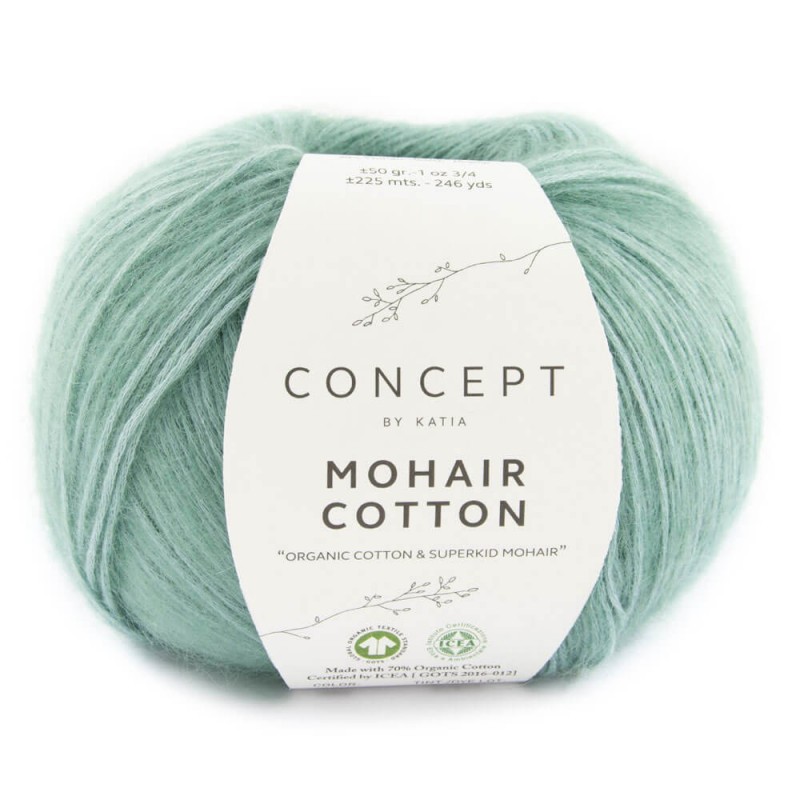 Katia Concept Mohair Cotton is a lightweight yarn made of fine fibers, but it presents a fluffy aspect. Its braided and tubular thread is made of soft fibers of mohair and cotton. This yarn is extremely lightweight, fine, and elegant, perfect to knit both garments and accessories which will keep you warm during autumn and winter. Mohair Cotton by Concept Katia is made of: 70% organic cotton 30% superkid mohair This yarn has the ICEA [GOTS 2016-012] certificate which guarantees the organic origin of its cotton fibers. It also contains 30% of superkid mohair, a fiber coming from the first shearing of an angora goat, making it softer, and thinner.